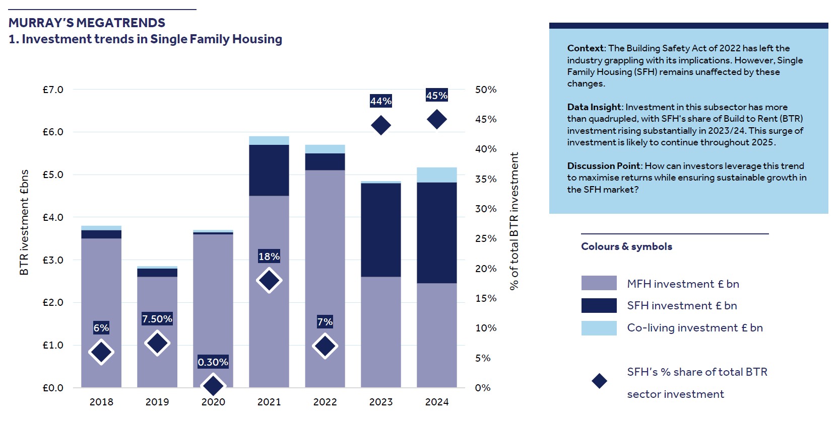 The data is striking: SFH's share of total BTR investment has skyrocketed from just 6% in 2018 to an impressive 45% by 2024. This represents more than a quadrupling of investment in this subsector, with the most dramatic shift occurring between 2022 and 2023 when 44% of all money deployed within the operational living market moved into single family developments.